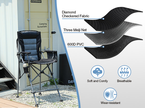 Stonehomy offers a premium director chair crafted from diamond checkered fabric and 600D PVC. This heavy-duty, wear-resistant chair is soft to the touch and perfectly breathable for hot summer days.